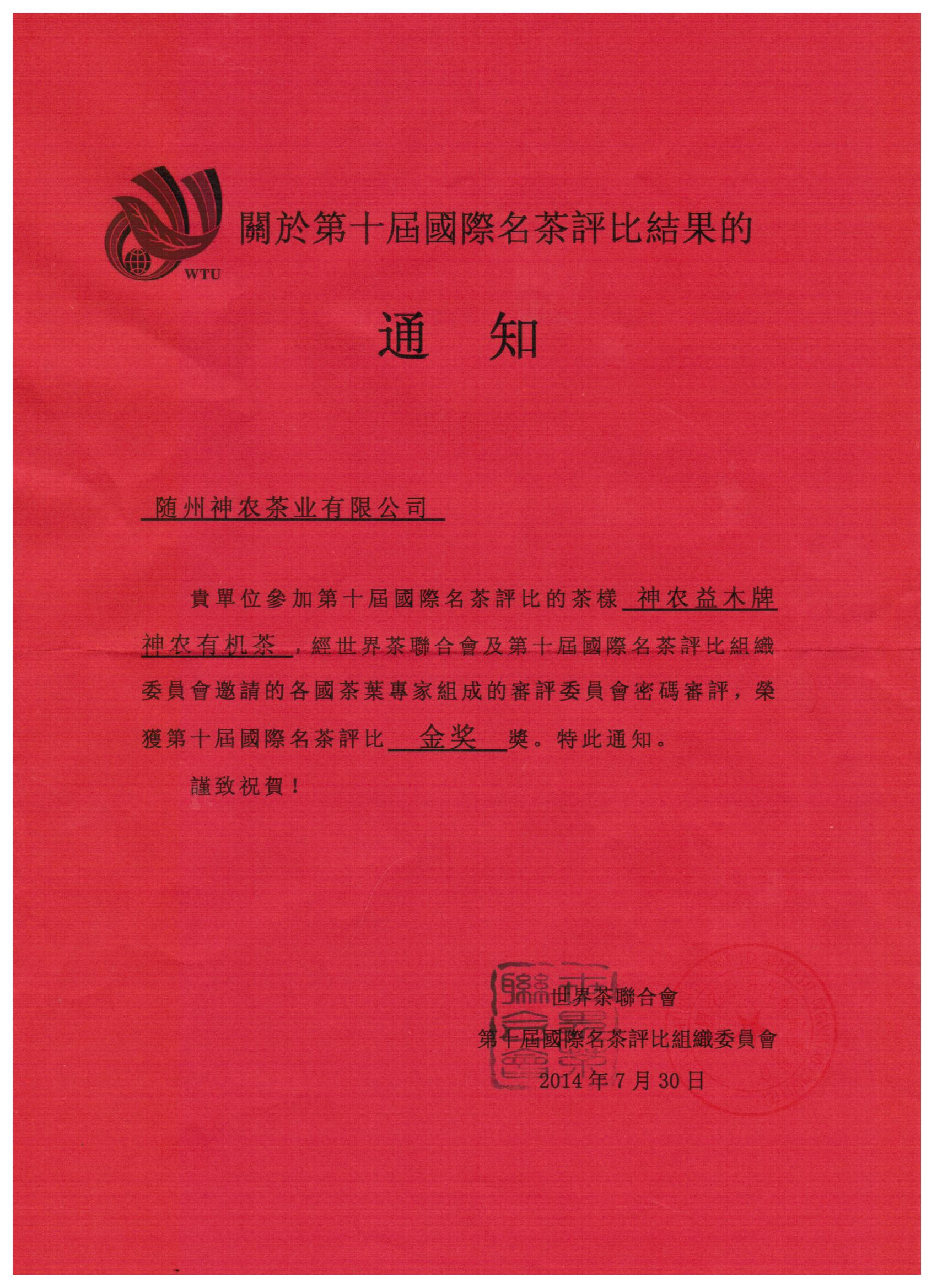 神農(nóng)有機(jī)茶"再次榮獲第十屆國(guó)際名茶評(píng)比"金獎(jiǎng)"